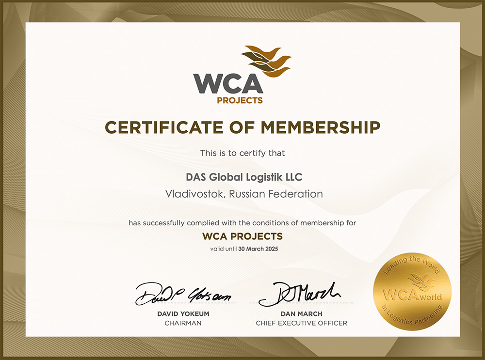 - Сертификат WCA PROJECTS, подтверждающий членство в международной ассоциации WCA PROJECTS по проектным грузам на 2025 г.